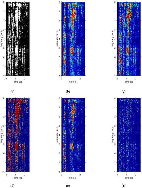 By way of example, Figure 2 shows color images of the ideal masks for a particular utterance mixed with babble noise at −5 dB SNR. The utterance was taken from the IEEE-Harvard corpus [43] and sampled at 16 kHz. A grayscale is used in the figure, with white pixels denoting a value of 1 and black pixels denoting a value of 0. Although they are not identical, broadly speaking, the same pattern is more or less evident in the masks labelled (a) to (e). However, for the mask labelled (f), which is the imaginary part of the cIRM, the pixels are predominantly black, suggesting that most mask values are closer to 0 (noise-dominated).