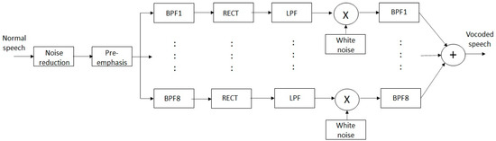 Channel vocoders have been widely used to simulate speech processing in cochlear implants, as described by Cychosz et al. [48]. For the purposes of this study, an eight-channel noise vocoder (see Figure 4) was used for CI simulation. The pre-emphasis filter had a cutoff frequency of 2 kHz and a roll-off of 3 dB/octave. The band pass filters (BPFs) in the eight channels had center frequencies of 366, 526, 757, 1089, 1566, 2252, 3241 and 4662 Hz. The low pass filters (LPFs), which follow the rectification stage (RECT), had a cutoff frequency of 120 Hz. The noise vocoder was used to vocode the normal speech so that it mimicked the sound heard by the wearer of a cochlear implant.