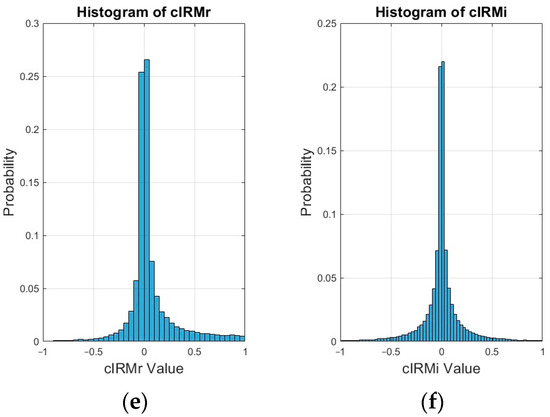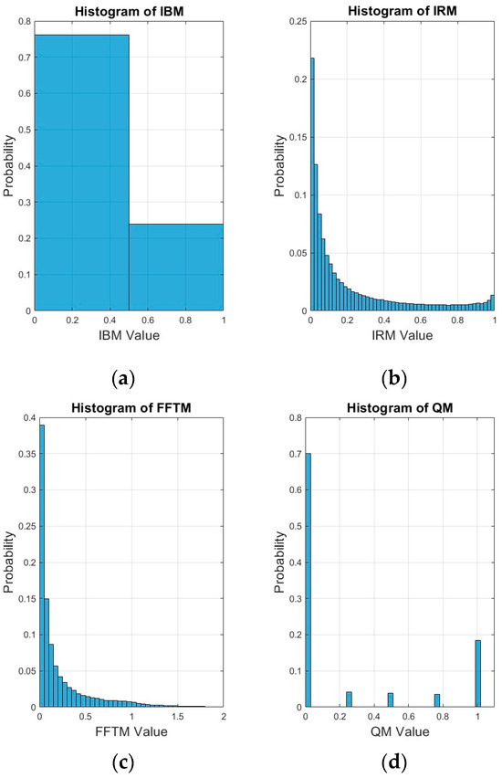 Histograms for the ideal masks for the utterance “choose between the high road and the low” mixed with babble noise at −5 dB SNR: (a) IBM; (b) IRM; (c) FFTM; (d) QM, (e) cIRMr; (f) cIRMi.