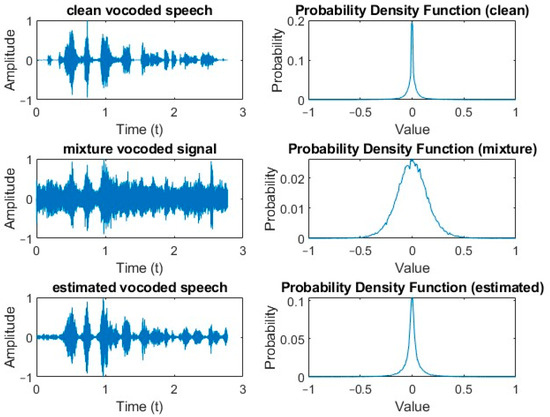 Euclidean distance has been used in various audio applications such as in measuring the similarity of a speaker’s voice characteristics [60], performing speech recognition [61], and measuring the similarity between two songs [62]. Therefore, it was decided to use a final group of measures to estimate the similarity between clean vocoded speech and estimated vocoded speech. Histograms were generated (using Scott’s Rule for the optimum number of bins) for clean, mixture (i.e., noisy), and estimated vocoded signals. These were normalized to represent probability distribution functions (pdfs) and the distance/similarity between various pdfs was measured. All metrics were defined and categorized by Cha in [63]. For this study, only distances were used, where similarity (s) was related to distance (d) in Equation (23) as follows: