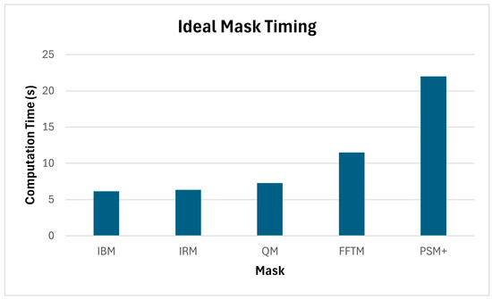 The masks were also compared in terms of their respective computational load based on a standard Windows laptop (Intel Core i7 processor) running MATLAB R2023b. The time was measured for how long it took to generate the 600 training mixtures and calculate the respective ideal masks. This was achieved using babble noise at −5 dB SNR. The results are illustrated in Figure 9. As expected, the IBM took the least amount of time (6.14 s) as it is the simplest mask. The IRM took slightly longer to calculate (6.33 s). The QM, which is one of the proposed new masks, took slightly longer at 7.27 s. This was followed by the FFTM at 11.49 s. The mask that took the longest time to calculate was the PSM+ at 22.00 s. The main reason for this was that in effect, two masks were being calculated, i.e., the PSM and the IRM. Also, the PSM involves the calculation of the cosine of a phase angle.