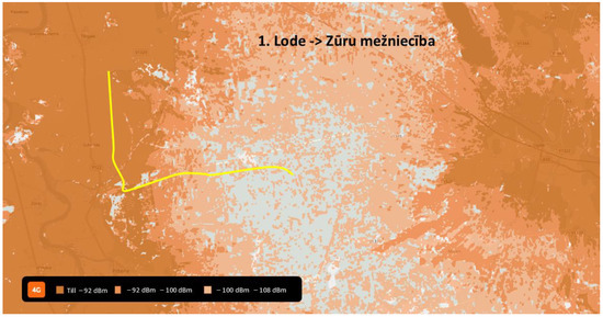 To verify the proposed KPIs (see Table 4) of the network and satisfy the safety criteria for autonomic drone flights in the future, the testing of the network parameters was conducted at several altitudes on a specified trajectory near the towns of Lode and Piltene (see Figure 3, thick yellow line). Lode and Piltene are located northwest of the map (number 1 in Figure 2).