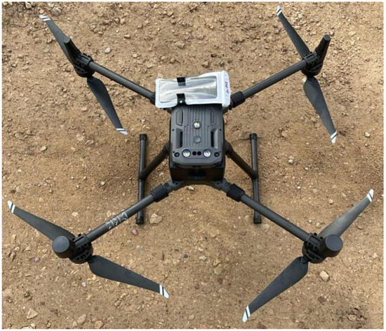 The altitudes chosen were 40, 60, 90, and 110 m. Measurements were conducted using a OnePlus NORD BE2029 mobile phone with its original integrated antenna with the capability of operating on 2G, 3G, 4G, and 5G bands. The phone was attached to a DJI M30 drone to ensure the measurements at the set altitudes were possible. The dedicated software used was the Echo One mobile network analyzer made by Enhancell (Oulu, Finland) [48]. The image of the used setup is seen below (see Figure 4). The phone was in a waterproof case during the measurement. This was done for security reasons, e.g., deterioration of the weather would not damage the phone.