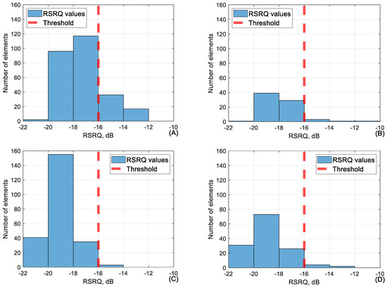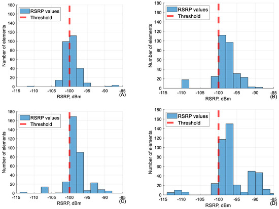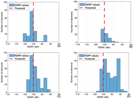 The conjunction between RSRQ and RSRP at RSRQ range (−16 to −18 dB) at (A) 40 m, (B) 60 m, (C) 90 m and (D) 110 m heights.