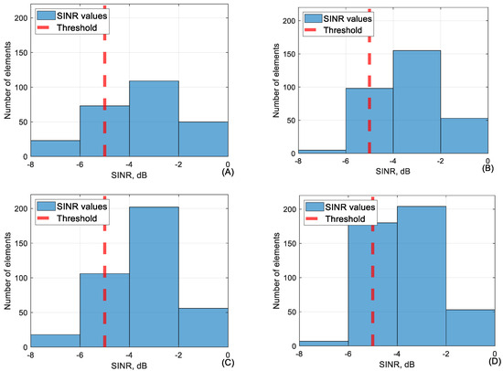 The conjunction between SINR and RSRQ in SINR range (−5 to −7.5 dB) at (A) 40 m, (B) 60 m, (C) 90 m, and (D) 110 m height.