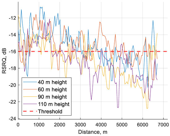 Percentages of values above the threshold at 40, 60, 90, and 110 m. RSRQ was between −14 and −16 dB, −16 and −18 dB, −18 and −20 dB.