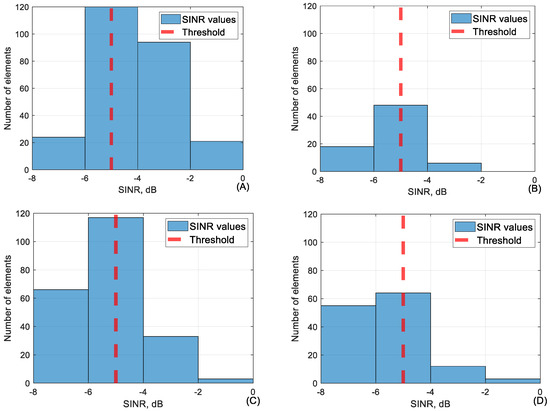 The conjunction between SINR and RSRP in SINR range (−5 to −7.5 dB) at (A) 40 m, (B) 60 m, (C) 90 m, and (D) 110 m height.