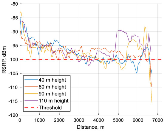 Percentages of values above the threshold at 40, 60, 90, 110 m. RSRP values between −95 and −100 dBm, −100 and −105 dBm, 105 and −110 dBm.