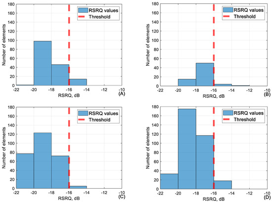 As shown in Figure 7, during the flight, the RSRQ values fluctuated significantly and were often below the set KPI of −16 dB, but even with RSRQ falling below the set threshold, other parameters did not suffer high losses.