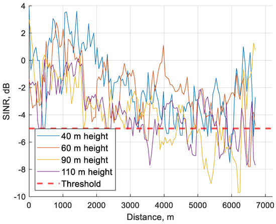 SINR average value over 50 m distance during the whole flight at 40, 60, 90 and 110 m height.