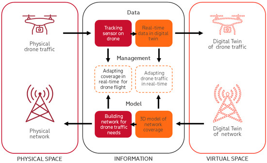 For safer and more efficient UAV traffic management and applications through cellular connectivity, real-time digital twinning (DT) of mobile network coverage and performance is seen as a revolutionary technology that will undoubtedly shape the next generation of aircraft and spacecraft [49]. Therefore, mobile network measurements described in this research were also used to test the precision and usability of the DT platform for automated analytics of cellular connectivity in the airspace with flight path analysis and data for BVLOS drone operations—“AirborneRF” [50]. A model of mobile network coverage and UAV flight DT was developed to elaborate on the future research directions for the management of cellular network-enabled UAV-traffic management, see Figure 14. The set of KPI values developed could be used in the DT of mobile network coverage to plan and manage UAV traffic or adapt the network infrastructure to ensure continuous connectivity for UAV flights. According to defined KPIs, different altitudes or routes could be proposed for UAV flights. Those KPIs in DT could also serve as reference points for the deployment and upgrade of mobile network infrastructure.