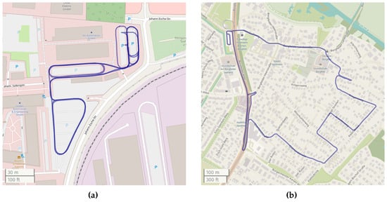 The ground-truth position is given by RTK-corrected GNSS measurements provided by a ublox F9P receiver at 10 Hz. When the GNSS solution has a quality of “RTK fix” (i.e., integer solution), the position accuracy is within 0.05 m. All data points with a worse quality are excluded. For the datasets “Parking lot”, “City”, and “Urban freeway”, the vehicle was equipped with a second ublox F9P receiver operating in moving base mode, which provides a precise heading (and pitch) estimate with an accuracy of less than 1°. In the case of the “Suburb” dataset, a second receiver was not available, and the heading is estimated from the vehicle’s movement. The assumed accuracy is about 5°. The ground-truth trajectories are shown in Figure 1.