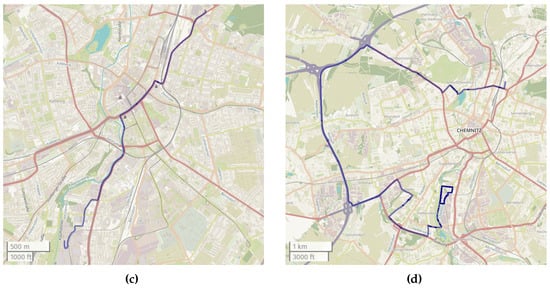 Ground-truth trajectories of the evaluation dataset. (Maps generated using UMap based on OpenStreetMaps data). (a) Parking Lot; (b) Suburb; (c) City; (d) Urban freeway.