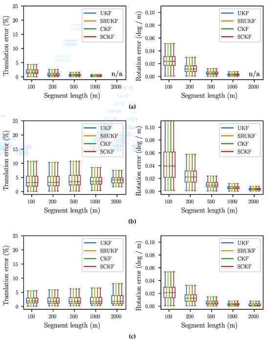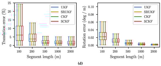 The resulting box plots are shown in Figure 2. The median of the translation error is between 7% and 1%, while the rotation error is between 0.04 °/m and 0.005 °/m. For all datasets, the rotation error decreases with the segment length. For the “Parking lot” and the “Urban freeway” scenario (see Figure 2a,d), this also holds true for the translation error, while for “Suburb” and “City” (see Figure 2b,c), it is rather constant. The smallest translation error can be observed for “Parking lot”, which can be explained by the short overall distance. The “Urban freeway” scenario, with its long distance and high speeds, has the highest translation error, particularly for short segment lengths. The “Suburb” dataset has the highest rotation error, which is caused by the fact that a different IMU is used here. Regarding the scope of this work, the most significant insight is that the SRUKF and the SCKF have exactly the same performance as the UKF and the CKF.
