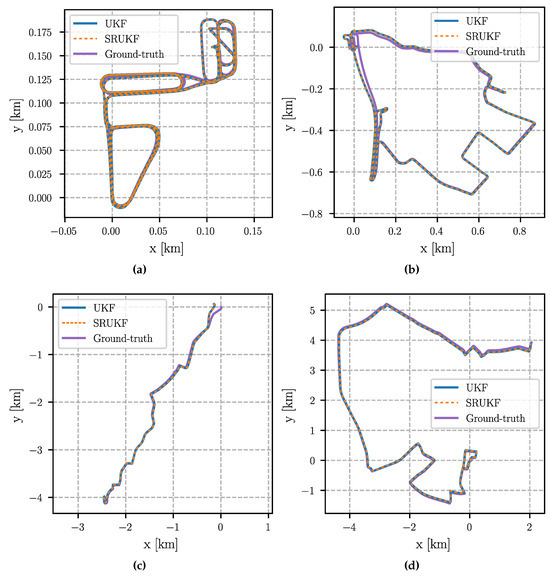 Estimated trajectories of the UKF and SRUKF aligned using an transformation to the ground-truth trajectories. Note the different scale of the figures. (a) Parking Lot; (b) Suburb; (c) City; (d) Urban freeway.