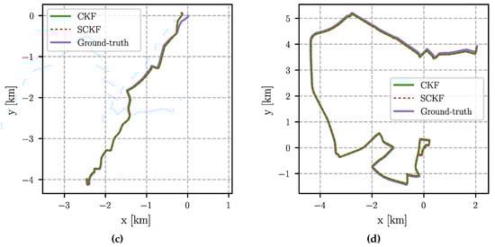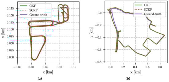 The aligned trajectories are shown in Figure 3 and Figure 4. All estimated trajectories show a small drift compared to the ground-truth, which cannot be avoided without absolute position corrections. Most noticeable is a deviation at the beginning of the “City” scenario (top right in Figure 3c and Figure 4c). This is likely caused by the fact that the estimate of the IMU biases did not match the true values while they converged later. It is again evident that the performance of all filters is equivalent since the estimated trajectories of the UKF and the SRUKF, as well as the trajectories of the CKF and the SCKF, align perfectly with each other.