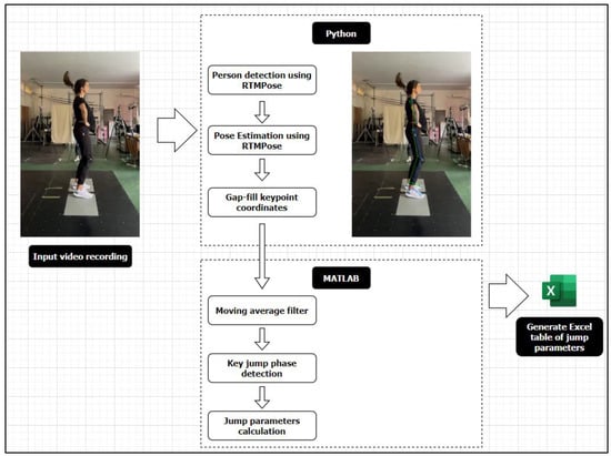 Conversely, tools like OpenPose [], BlazePose [], OpenCap [], and MMPose [] leverage deep learning-based algorithms to offer advanced capabilities for biomechanical analyses. These tools enable simultaneous tracking of multiple joints and extraction of a wide range of biomechanical variables essential for in-depth performance assessments [,]. For instance, analyzing joint angles at the ankle, knee, and hip during the take-off and landing phases of a jump can reveal asymmetries or weaknesses that may predispose an athlete to a greater risk of lower-limb injury []. Additionally, variables related to jump phase durations and jump height provide valuable insights into an athlete’s explosive power and neuromuscular efficiency, which are crucial for optimizing training and tracking athletes’ progress over time [,].