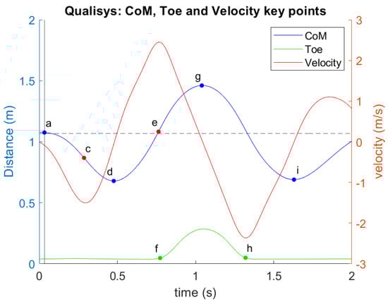 As illustrated in Figure 3, key phases of the jump are marked by 9 specific points: At point a, the CoM begins downward movement, which is identified when CoM velocity exceeds 5% of the maximum velocity. The velocity then reaches its first minimum at point c, corresponding to a transition phase before the upward thrust. Point d indicates the lowest CoM position (first minimum of CoM height) before take-off, followed by reaching the maximum CoM velocity at point e. Then, the toe marker lifts off the ground at point f, signifying the start of the flight phase of the jump. The maximum CoM height occurs at point g. As the jump concludes, the CoM and toe descend, returning to their initial positions at point h, with the CoM reaching its second lowest point at i (second minimum of CoM height).