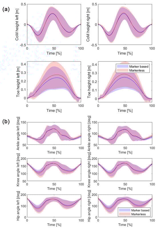 Comparison of time-normalized displacement trajectories between marker-based and markerless systems from both the left and right sides. These trajectories illustrate the movement of (a) the center of mass (CoM) and toe height, and (b) ankle, knee, and hip angle changes during the entire duration of the countermovement jump (CMJ) task. Solid blue lines represent data from the marker-based system, while red lines represent data from the markerless system. The shaded areas around each line indicate the variability expressed as 95% confidence intervals (CI).