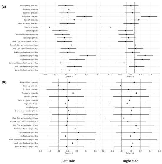 Cohen’s d effect size values and corresponding confidence intervals comparing marker-based (a) and markerless (b) systems for key temporal CMJ variables obtained from both sides (left and right). The dashed line indicates a small effect size.