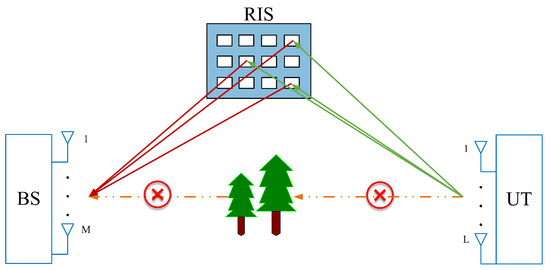 As shown in Figure 2, we consider a fully passive RIS-aided MIMO system along with a quasi-static flat fading channel. To maximize signal coverage, RIS is assumed to be deployed on the surface of a tall building. UT communicates with BS through RIS. The UT-RIS channel varies faster than the RIS-BS channel. The BS and UT are equipped with and antennas, respectively. RIS consists of reflecting elements. Due to an unfavourable propagation environment, our system ignores the direct line-of-sight path between BS and UT.