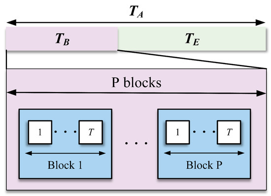 A transmission frame is taken into account, as depicted in Figure 3. Specifically, coherence time , is significantly smaller than , where and represent the data transmission phase and the semi-blind estimation phase, respectively. During the semi-blind estimation duration, is divided into time blocks, and each time block comprises T time slots, i.e., .