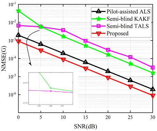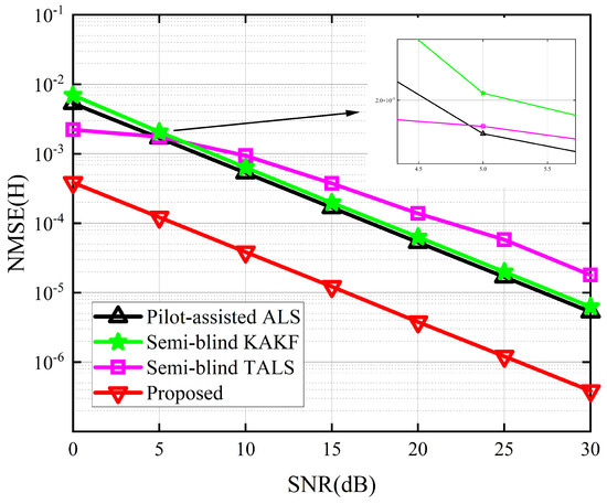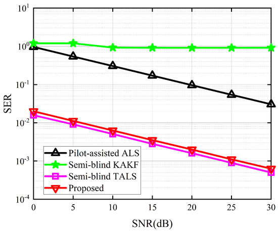 The performance of the proposed receiver in terms of SER and NMSE of and are depicted in Figure 4, Figure 5 and Figure 6. Due to the absence of an iterative process in the symbol matrix estimation phase of the KAKF receiver, its SER remains invariant with varying signal-to-noise ratio (SNR). Figure 4 shows that the proposed receiver outperforms the ALS receiver and the KAKF receiver. Specifically, compared to the worst-performing KAKF receiver, the proposed algorithm exhibits a reduction in SER by two to three orders of magnitude. This is attributed to the structural advantage of the ALS algorithm, which involves iteratively refining the feature matrix in a step-by-step manner, with each iteration contributing to a reduction in error. The proposed receiver lags slightly behind the TALS receiver by approximately a 2 dB SNR gap. This is owing to the TALS receiver estimates the matrices simultaneously. In contrast, our proposed receiver is divided into two phases to estimate them, resulting in the parameters of our proposed receiver engaged in the symbol estimation stage being less than those of the TALS receiver. However, it is acceptable to sacrifice a small portion of SER performance to achieve greater gains in NMSE. From Figure 5 and Figure 6, we can see that the proposed receiver has gained more accurate channel estimation in comparison with other methods. Specifically, the proposed receiver exhibited a minimal SNR gap of approximately 3 dB and 16 dB for channel and channel, respectively. This is because our proposed method contains two tensor decomposition processes, which could be regarded as denoise operations. The superiority in CE of our proposed algorithm also implies that, even though errors would propagate between the two estimation stages in the proposed receiver, we address this by reconstructing the received signals in the second stage and treating the propagation errors as noise for CE. Then, we exploit the noise reduction property of PARAFAC decomposition, thereby effectively mitigating the propagation errors.