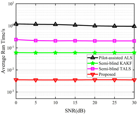Figure 7 depicts the average run time between the different receivers. The average run time takes into account the number of iterations required for convergence, thereby enabling a comparison of the complexity between iterative and closed-form solutions. The results show that the proposed receiver outperforms the other three receivers. In comparison to the best-performing KAKF receiver, the proposed algorithm demonstrates a decrease in average run time by almost one order of magnitude. This is attributed to the exploitation of the low-rank property of tensor decomposition, which enables us to reduce the dimensionality of the received signal. Figure 8 depicts the iterations to converge between the different receivers. From Figure 8, we can see that the proposed receiver achieved a minimum number of convergence iterations. This is because we harness the inherent mathematical properties embedded within the received signals to simplify the objective function, thereby facilitating the convergence of the cost function during the alternating optimization process for the symbol matrix and the channel matrices.
