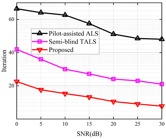The computational complexity of the proposed algorithms mainly lies in the matrix pseudo-inverse operations, which are contained in steps , , , , of Algorithm 1 with complexity orders of , , , , and , respectively. Therefore, the total complexity of Algorithm 1 is , respectively. The dominant complexity of the PARAFAC-based pilot-assisted receiver [13], KAKF semi-blind receiver [24], and TALS semi-blind receiver [26] are , , and + , respectively. Our proposed algorithm has lower computational complexity compared to these competitive algorithms. Moreover, to eliminate the scale ambiguity inherent in Algorithm 1, we normalize the first column of and . It is assumed that the first column of symbol and UT-RIS channel are known in BS.