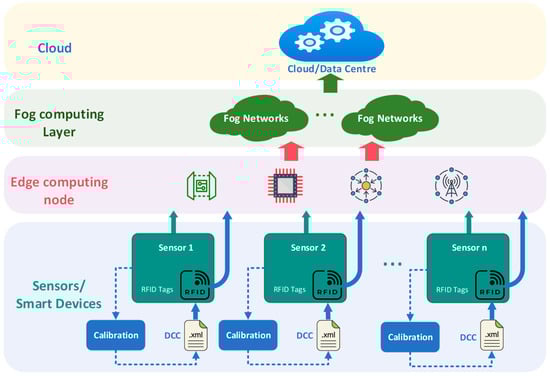 The digital transformation of metrology is primarily driven by the emerging requirements resulting from the digitalization of industries. In Industry 4.0, DCC will serve as a unified data medium connecting data applications (e.g., digital twins), industrial control systems, and field sensors, which will be able to rule out transmission errors, and the calibration results are immediately available for further processing. The realization of Industry 4.0 requires comprehensive process awareness, which poses new challenges for measurement and data acquisition. Massive sensors are interconnected through the IIoT (Industrial Internet of Things) [20]. In order to cope with the pressure on the cloud brought about by the large number of sensors’ data acquisition, the measurement data from the field will be computed at appropriate nodes closer to the field through the edge layer and the fog network layer and aggregated in the cloud. The DCC is stored in an RFID tag affixed to the sensors, and the data acquisition system can read the DCC file in the RFID tags, so as to effectively utilize the calibration data. The RFID tag as a DCC carrier in the sensor network application scenario is shown in Figure 1.
