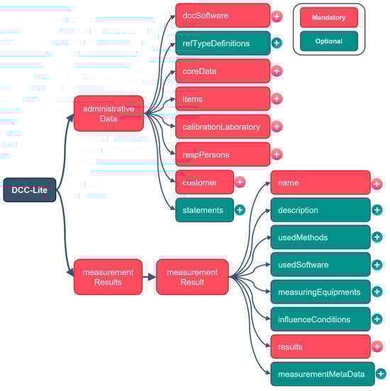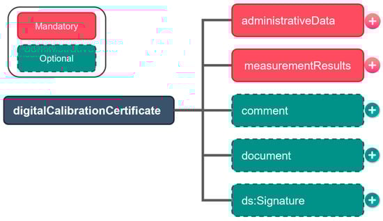 The PTB-coordinated DCC, provided in the Extensible Markup Language (XML), is a highly popular solution for DCCs [1,26], and the DCC discussed in this paper is a PTB-coordinated DCC. The DCC depended on a standalone schema (dcc.xsd), which consists of a root element and a tree-like structure. The current version of the DCC’s XML schema (3.2.1) has a root element called “digitalCalibrationCertificate”, which contains five child elements: administrativeData, measurementResults, comment, document, and signature; its structure is shown in Figure 2.