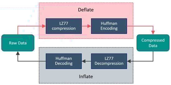 The compression algorithm employed by Zlib is the Deflate algorithm [33], which is a lossless compression algorithm based on the LZ77 compression algorithm with Huffman coding. The decompression process is the reverse of the compression process. The principles of Zlib’s compression and decompression algorithms are illustrated in Figure 4.