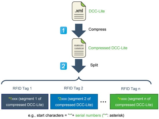 DCCs are divided into several segments based on the capacity of the tags. At the beginning of each segment, a start character is added, which is then written into the corresponding tag. This inclusion of the start character aids in the subsequent reading and splicing operations. The schematic diagram illustrating the storage of DCC-Lite using groups of RFID tags is depicted in Figure 5.