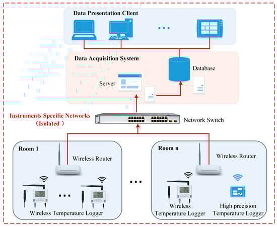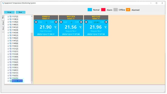 To ensure security management, the system utilizes an isolated LAN specifically designed for instrument use. This LAN is physically separated from the office network and the internet. A data acquisition system based on .Net (C#) is employed to receive real-time JSON packets transmitted by the wireless temperature sensors. The system parses and stores the temperature data in a database and provides services such as temperature overrun alarms. A client program is developed for data display, allowing computers or tablets within the isolated LAN to view real-time and historical temperature data. The architecture of the test system is depicted in Figure 6.