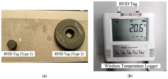 (a) RFID tag used in the system; (b) RFID tags affixed to the wireless temperature logger.