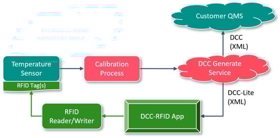 The wireless temperature logger utilized in the system undergoes calibration, and the DCC generate service generates DCC and DCC-Lite according to the calibration data. The generated DCC is either pushed to or made accessible through an interface to the customer quality management system via the DCC platform for retrieval. On the other hand, the generated DCC-Lite is compressed and written into the RFID tag group attached to the measuring device using an RFID reader/writer. This facilitates the seamless flow of DCC alongside the measuring device and instrument. The implementation process is illustrated in Figure 8.