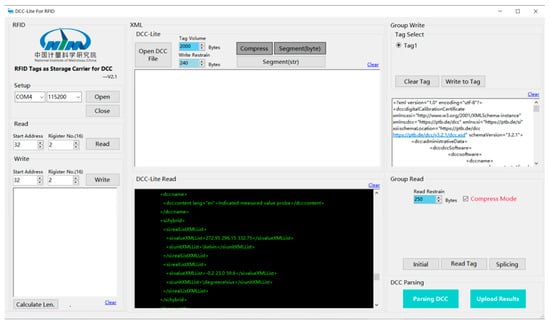 The body of the wireless temperature logger is equipped with two RFID tags, each with a capacity of 2000 bytes. The digital calibration certificate (DCC) is stored within this group of tags. The DCC-RFID app is utilized to read and parse the DCC from the RFID tag attached to the wireless temperature logger. The resulting compensation data are then stored in the database of the data acquisition system. Figure 12 illustrates the user interface of the DCC-RFID app during operation.