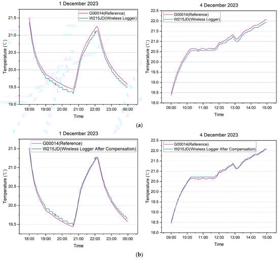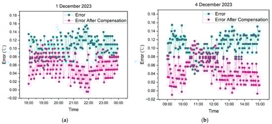 (a) Comparison of display errors of measurement data of wireless temperature logger (W215JD) before and after compensation (data date: 1 December 2023); (b) Comparison of display errors of measurement data of wireless temperature logger (W215JD) before and after compensation (data date: 4 December 2023).