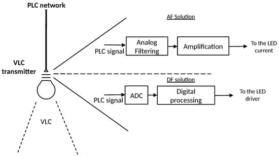 In addition, Figure 2 shows two simplified block diagrams containing the intrinsic features of each solution. To summarize, inside the VLC transmitter, an AF solution would require a set of passive and active electronic devices in order to successfully exactly match the PLC waveform into the LED current. On the other hand, a DF solution would be pass through and analog-to-digital converter (ADC), where a digital processing can be performed on the signal to be forwarded to the LED driver.