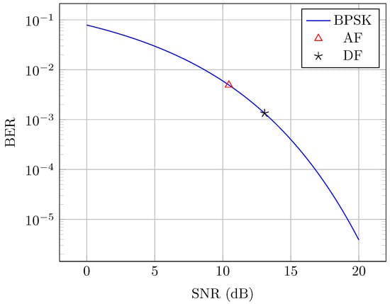As can be seen from Equations (3) and (4), the main difference is that in the AF case the PLC noise is carried with the signal of interest, but in the DF case this noise is eliminated once the signal is digitized. This will directly impact the signal-to-noise ratio (SNR) of the signal, which in turn impacts communication performance. One way to evaluate this is through a bit error ratio (BER) comparison between the two cases for an equal signal power.