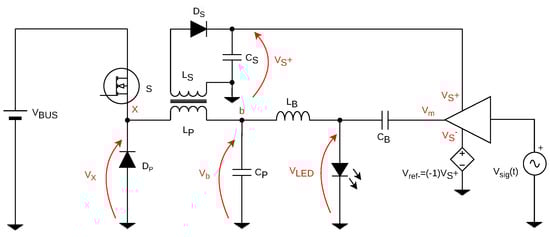 Figure 6 shows the base topology proposed. A buck converter is used to process power from a voltage source in order to deliver both functions of average lighting and VLC transmission. A secondary winding in the form of is provided to deliver a voltage that powers a linear power amplifier (LPA). Here, the LPA is seen as a secondary load that will be powered by the secondary winding of the converter. Moreover, a symmetrically-fed LPA is proposed in order to avoid distortion and allow for a zero DC input signal to be used as a the main VLC signal for communications. A voltage-dependent voltage source is therefore added in order to provide the negative voltage level for the amplifier, based on a multiplicative factor of −1 of the voltage delivered by the winding (node ). Hence, this symmetrical voltage range opens the door for the use of more robust commercial solutions of linear amplifiers, such as operational amplifiers which are less subjected to noise and have better input/output features for signal processing.