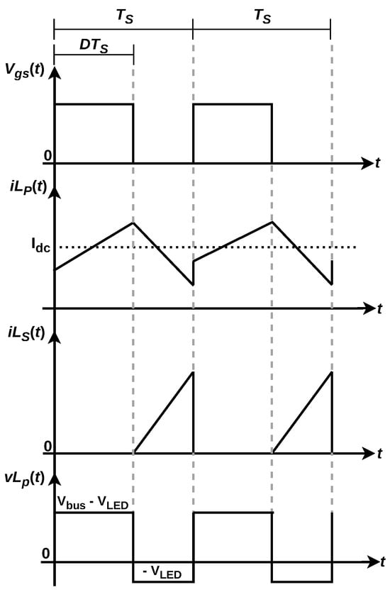 Figure 7 displays the operating steps, the current waveforms and the voltage behavior on the main coupled coil, responsible for powering both outputs. They are given in function of the command signal that controls the on-off behavior of switch S. The polarity of the coupled coil pair (,) is devised in a way so the average output voltage at the LED load directly bias diode during the off stage, allowing for the transfer of power to the secondary. Following, holds the voltage to feed the LPA for VLC.