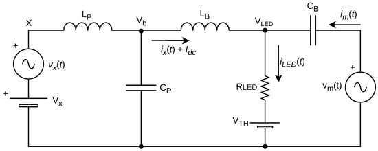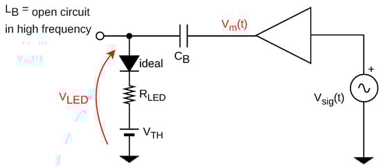 Furthermore, a bias-T circuit, consisting on the pair and , is proposed to serve as a coupling system to deliver at the output a DC level of current, biasing the LED load, and also an AC signal corresponding to the VLC signal with a given modulation coming from node .