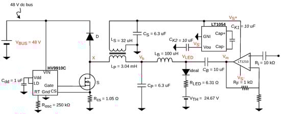 - Ferraz, R.M.; Resende, L.H.G.; Braga, H.A.C.; Almeida, P.S.; Soares, G.M. Non-linearized Complete State-Space Model of an LED Driver Based on the LC Resonant Converter. In Proceedings of the 2018 13th IEEE International Conference on Industry Applications (INDUSCON), Sao Paulo, Brazil, 12–14 November 2018; pp. 517–522. [Google Scholar] [CrossRef]