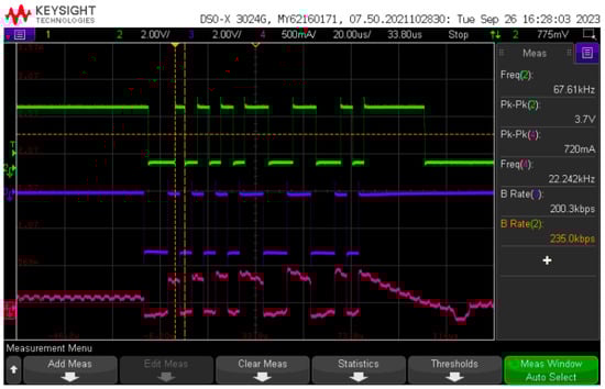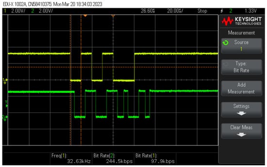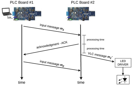 Finally, Figure 13 displays a time diagram of the PLC communication networks and its interaction with the PLC-VLC setup. A message is sent by board #1 and forwarded by board #2 to the VLC setup. The board processes and copies the content as a message and forwards to the LED driver in the form of a BPSK signal by using the dedicated UART module of the SAM55 MCU.