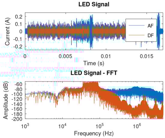 In this section, we provide a simulation considering a communication symbol of both AF and DF techniques. Figure 14 shows a waveform of the output LED current, along with their frequency spectra.
