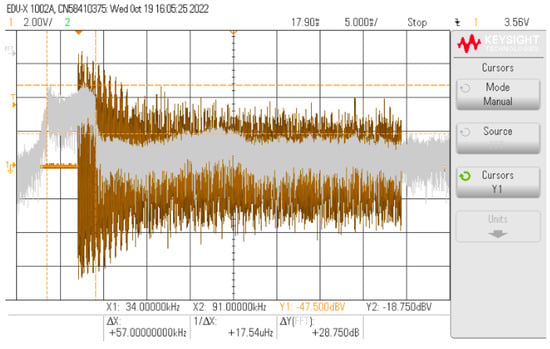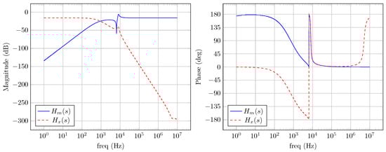 A simulation was performed in LTSpice considering the circuit model proposed in Figure 8. The goal is to check the converter’s frequency responses of the transfer functions that affect both the communication signal and the PWM signal of the converter , the latter being treated as an interference. Thus, Figure 16 displays the simulated transfer functions frequency responses.