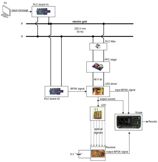 For example, a prototype of this nature may be based on connecting a PLC circuit capable of processing information sent by the power grid and delivering it to a VLC lamp. According to the specialized literature, there are two methods to perform this transmission [6,15]: