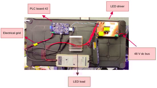 Figure 17 displays a block diagram of the proposed setup. The electrical grid consists of a 60 Hz 220 V rms bus that is used as the communication medium for PLC and to power a PFC stage that converts that processes a 48 V DC bus for powering the LED driver. The board used to execute this task is a evaluation board designed by ST Microelectronics, part number EVAL-PSR01B-35W. A PLC filter coil (part number FN2010-10-06) is also used to isolate the interference from the PFC stage on the PLC network utilizing the grid. The receiver is powered by a 9 V battery, and thus isolated from the grid and separated by a distance of 1.2 m from the VLC transmitter, on a line of sight configuration.