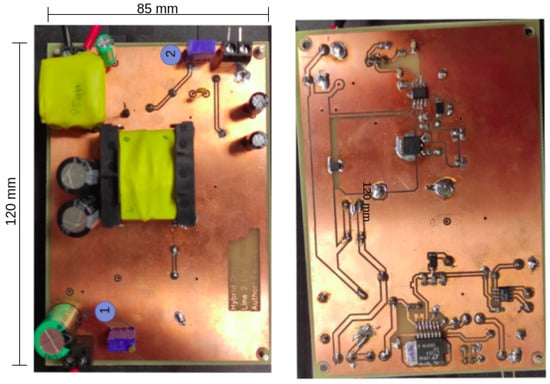 Figure 18 displays a top view of the setup showing the Microchip board as the PLC board #2 connected to the driver. Figure 19 displays the designed PCB for the LED driver circuit, where (1) indicates the 48 V input and (2) indicates the input for the BPSK signal. Figure 20 displays the designed PCB for the receiver circuit.